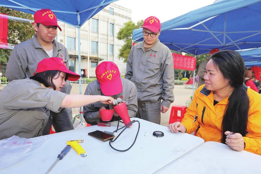 “小伙子,这个电烤箱坏了,你看能修好吗?”“没问题,我帮您搞定。”“这些相片可以帮我过塑吗?”“可以,马上就给您过塑”……上午9时许,活动刚刚开始,广场上就聚集了许多群众,面对群众的每一个困难或疑问,志愿者都热情解答,并一一动手解决。